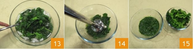 drain the turnip greens and transfer them to a bowl with ice to cool them and retain the color 13. Divide the greens into two bowls: blend with an immersion blender those in one bowl 14 and leave the others whole 15.