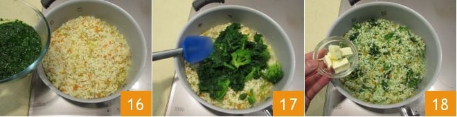 Towards the end of the risotto's cooking, add the blended turnip greens 16 and the whole ones 17 and salt. When the rice is ready, turn off the heat and stir in the butter 18
