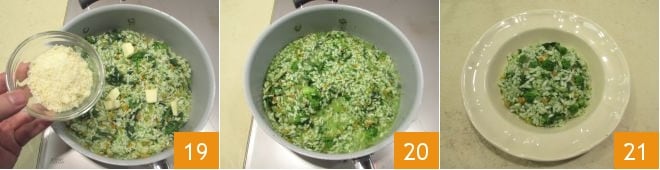 the grated Parmesan 19, mix to bind the ingredients well 20, and serve the risotto with turnip greens hot 21.