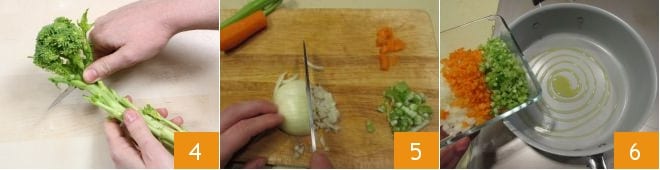 Take the florets and detach them one by one from the stalk 4. Once the broth is ready, you can begin preparing the risotto: peel the carrot, peel the onion, and remove the outer fibrous membrane of the celery with a vegetable peeler, chop all the vegetables 5, heat the olive oil in a high-sided pan, add the chopped vegetables 6 and sauté for at least 5 minutes,