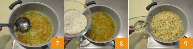 adding some broth to prevent the soffritto from browning too much 7. Then add the rice 8 and toast it, stirring with a spoon, then deglaze with the white wine 9