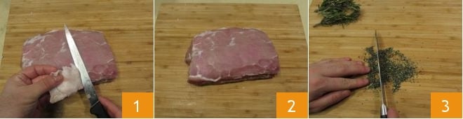 To prepare the roast pork in porchetta, start by removing the tendons with a sharp blade 1. Let the blade slide between the meat and the translucent white part, being careful not to cut the meat 2. This operation serves to eliminate the toughest part of the meat. Set the loin aside and finely chop the rosemary with a knife 3.