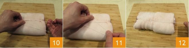 At this point, you will need to How to tie a roast. So wrap the string lengthwise, tying the ends 10. Leave a longer piece of string. Make a first knot on the upper part of one of the two ends to secure the base 11. Then continue to repeat, in this way the various slip knots will hold the rind firmly with the meat 12.