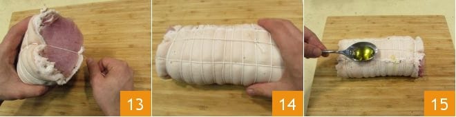 Finally, make a second round around the loin with the string, passing it along the top 13 and tighten with a knot 14. Sprinkle everything with a bit of extra virgin olive oil 15