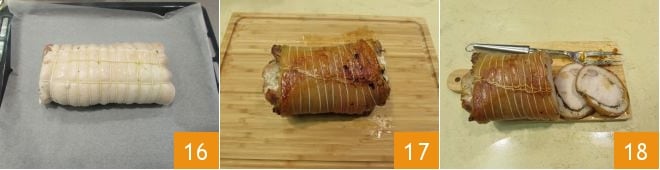and place the roast on a baking tray lined with parchment paper 16, bake in a preheated static oven at 375°F for 1 and a half hours (it's not recommended to use a convection oven, as the meat would dry out too much). To be sure about the cooking, use a meat thermometer and make sure it reaches the center of the loin, whose optimal temperature should be 156°F. Your roast pork in porchetta is ready 17 to be untied as you slice it 18! Enjoy your meal!