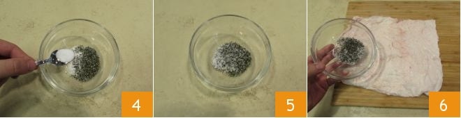 In a small bowl, add a pinch of salt 4 and mix with a teaspoon to combine everything 5. Place the rind on a cutting board and sprinkle the entire surface with salt and rosemary 6.