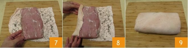 Place the pork loin in the middle 7 and carefully wrap it with the rind 8 so that the meat is completely covered 9.