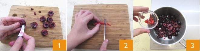 To prepare the robiola-stuffed peaches with spicy cherry sauce, start by preparing the sauce. Wash the cherries, remove the pits and stems, and cut them in half 1. Also chop the fresh chili pepper 2 and place it with all its seeds in a saucepan, along with the cherries 3.