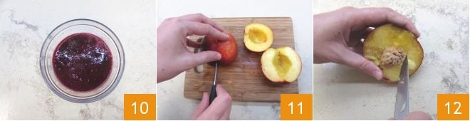 and place it in the fridge to cool for at least a couple of hours 10. You can get ahead by preparing the sauce a few days in advance, storing it in the fridge in an airtight container. Then move on to the peaches: cut them in half along the seam 11 and remove the pits 12.