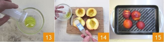 In a small bowl, combine the oil and salt 13, dip a kitchen brush and brush the emulsion on the cut side of the peaches 14. Heat a grill pan, and when it's nice and hot, grill the peaches on the cut side 15 for 3-4 minutes.