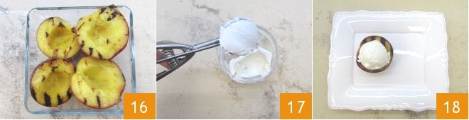When the peaches are ready, set them aside 16. In a small bowl, place the robiola, well chilled from the fridge, and mash it slightly with a spoon to make it creamy. Use an ice cream scoop to take a ball of robiola 17 and fill a peach half, which you will have placed on the dessert plate 18.