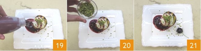 Take the cherry sauce, place it in a squeeze bottle to facilitate the operation, and drizzle about a quarter onto the plate 19. Finally, sprinkle with a quarter of the chopped pistachios 20 and complete the dish with a whole cherry 21. Repeat the same procedure with the other portions: your stuffed peaches are ready to be enjoyed!