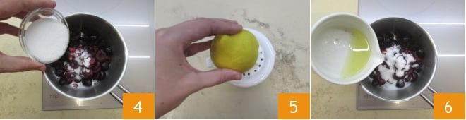 Add the sugar 4, then squeeze the lemon 5 and add the juice to the saucepan 6.