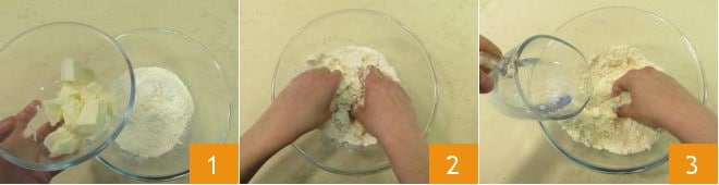 To make the rocket savory pie, first prepare the shortcrust pastry: in a bowl, pour the flour and the cold butter cut into pieces 1, quickly mix with your fingertips to obtain a crumbly mixture 2. Add salt, pour in the cold water 3