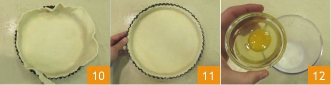 Place the dough sheet into the tart pan, trim the edges by cutting off the excess dough with a knife (10-11). Now, prepare the filling: in a tall glass, pour the cream, the egg 12,