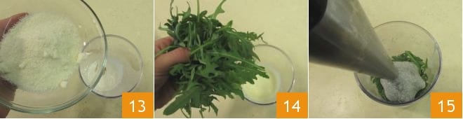 the Pecorino cheese 13, and 10 g of rocket 14, add salt and pepper, and blend everything with an immersion blender 15 until you obtain a smooth cream.