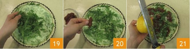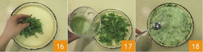Now spread most of the fresh rocket on the bottom of the tart pan 16, pour the cream on top 17, and spread it evenly with the back of a spoon 18.