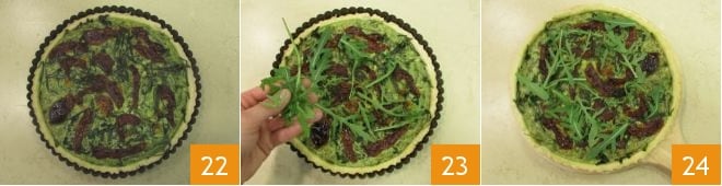 Add pepper and bake in a preheated static oven at 392°F for 25 minutes on the middle rack. Once baked, remove the savory pie from the oven 22, place the remaining fresh rocket as desired 23. Remove the rocket savory pie, place it on a cutting board, and serve it at the table 24.