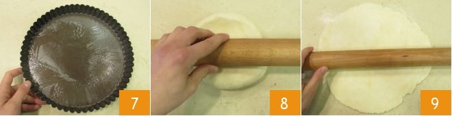 Grease a tart pan with a removable bottom that is 9 inches in diameter 7, then roll out the rested dough on a floured surface using a rolling pin 8 to a thickness of about 1/16 inch 9.