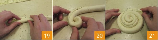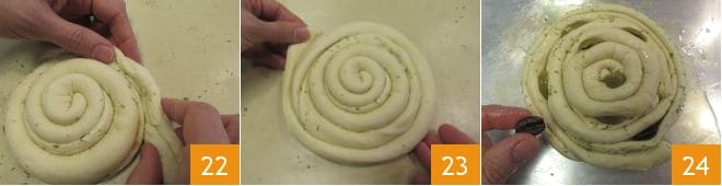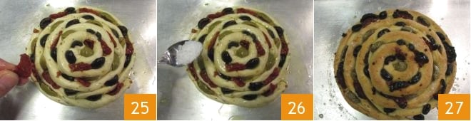 Fasten the other strip at the end of the spiral and continue the circle you started (22-23). Your rolled focaccia is ready: oil a baking sheet and place the rolled focaccia on it. Divide the pitted green and black olives in half lengthwise, then insert them here and there between the grooves of the spiral 24