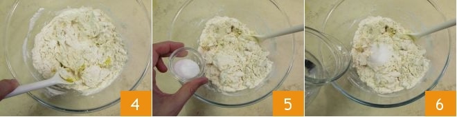 To prepare the rolled focaccia, combine the two flours in a bowl, add the fresh yeast 1 and pour in part of the room-temperature water 2. Mix with a wooden spatula, then also add half of the oil 3