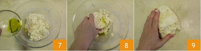 the remaining oil 7 and start kneading by hand 8, then transfer the dough to a lightly oiled work surface and handle it 9