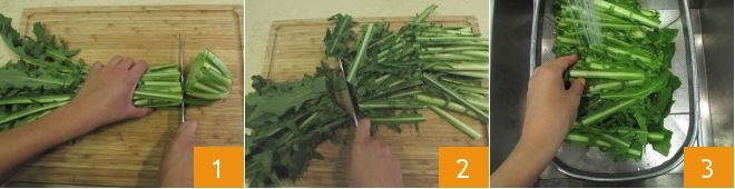 To make the rolls with Grana Padano and vegetables, first prepare the chicory: remove the ends of the stalks 1, cut it into 3 parts 2, and rinse it under running water 3.