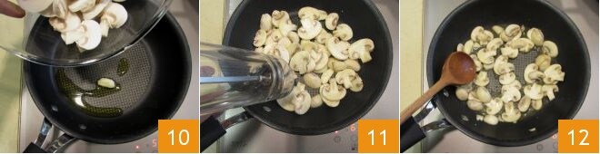 In a skillet, sauté a clove of garlic with a little oil, then add the mushrooms 10, season with salt and pepper 11, and cook over medium heat for about 5 minutes, then let them cool.