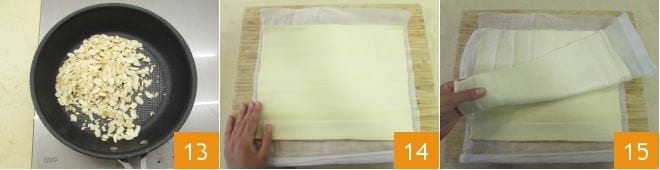 Finally, toast the almonds in a hot pan for about 3 minutes, being careful not to burn them 13. At this point, you can start assembling the ingredients: roll out the puff pastry on the work surface 14, then roll out the pizza dough over it, matching them up 15.