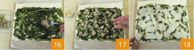 Spread the chicory over the entire surface, leaving a bit of margin on the edges, then add the mushrooms 16 and the toasted almonds, leaving some aside for decoration 17. Finally, cover everything with the Grana Padano PDO slices that you obtained with the help of a vegetable peeler 18.