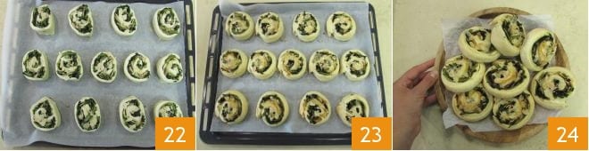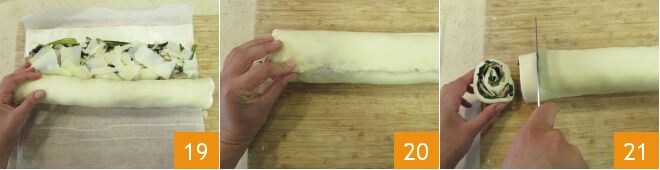 Roll the double pastry on itself from the longer side 19 and press gently to seal the closure 20, then remove the ends and cut the roll into slices about 1 1/4 inches thick 21.