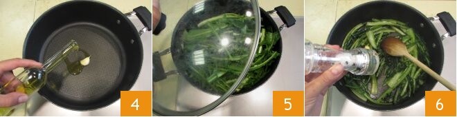 In a skillet, sauté a clove of garlic in its skin with a little oil 4, then add the chicory, cover with a lid 5, and cook over medium heat for 8 minutes. Season the chicory with salt 6 and pepper and let it cool.