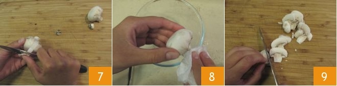 Now take care of the mushrooms: with a small knife, remove the end of the stem and peel the outer part of the cap 7, then gently wipe the mushrooms with a damp paper towel to remove any soil residue 8 and slice them thinly 9.