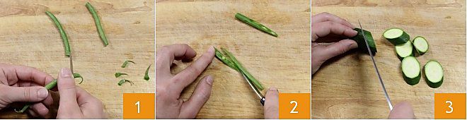 To prepare the gratinated turbot with vegetables, start by preparing the latter. Wash all the vegetables under cold running water. Then, with your hands, trim the green beans by removing the two ends 1, then cut the green beans in half with a knife or, for a more pleasing appearance, make an oblique cut along the length 2. Next, move on to the zucchini: remove the ends and cut them into oblique slices about 0.8 inches 3.