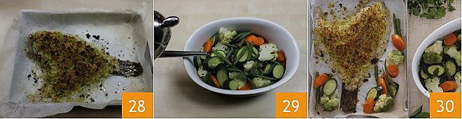 When the turbot is cooked and the breadcrumb topping is golden, take it out of the oven 28, retrieve the vegetables you set aside, and add chopped parsley with your hands, salt to taste, and a drizzle of oil 29. Then serve your gratinated turbot with vegetables hot! You can serve the turbot on a serving plate accompanied by the vegetables, or for a more "rustic" presentation, leave it in the baking tray and arrange some vegetables around the fish, while serving the rest as a side dish in the bowl 30!