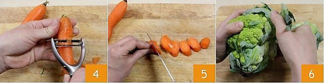 Now peel the carrots with a peeler 4 or a sharp knife; then cut off the ends and slice the carrots into oblique pieces about 0.8 inches 5. Finally, clean the green cauliflower: peel it with your hands 6.