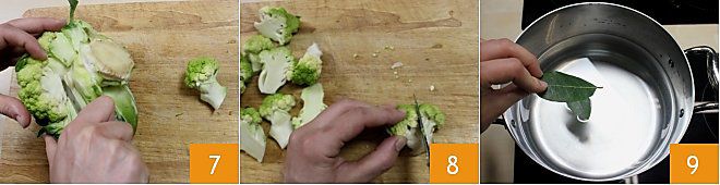 With a small knife, remove the florets from the cauliflower, cutting where the florets meet the central stem 7 and then split them in half 8. Now that the vegetables are ready, you can take a steamer and fill it halfway with water. Add the bay leaves 9 and heat the water.