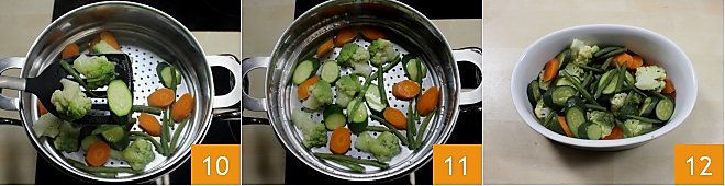 When the water is hot, place the steamer basket and pour in the chopped vegetables (10-11); steam the vegetables for 15 minutes. If you don't have a steamer, you can boil the vegetables for 8-10 minutes in a large pot. Once ready, transfer them to a bowl and set them aside 12.