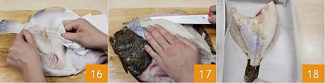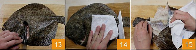 Now proceed to clean the turbot. Rinse the fish under cold running water. Transfer it to a cutting board and make an arched incision behind the gill (on the side covered with dark skin) to remove the guts 13. Then rinse it again under running water. Next, make a cut at the beginning of the tail to remove the skin 14. For this operation, use a knife and a cloth (or paper towel) because the turbot skin is very slippery and tough. Then lift the flap and gently pull the skin away 15.