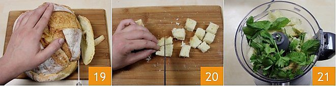 Then proceed to prepare the ingredients for the breadcrumb mixture: from the loaf of bread 19, take the crumb and cut it into cubes 20 (you can also use stale bread). Then put the crumb in a mixer along with the mix of aromatic herbs: parsley, basil, thyme, rosemary, and mint 21.