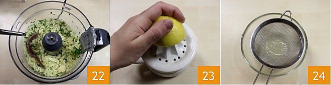 Chop all the ingredients. Then add the anchovy fillets, salt, and pepper to taste, and a drizzle of extra virgin olive oil 22; activate the mixer again. Finally, squeeze the juice of half a lemon 23 and strain it through a fine mesh strainer 24.