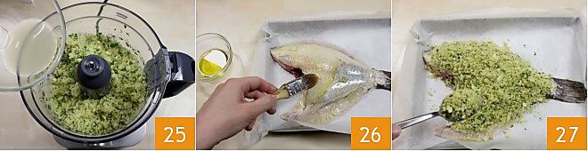 Add the lemon juice directly into the mixer 25 and activate it for the last time, until you obtain a homogeneous mixture. Now brush the surface of the turbot with oil using a brush 26 and sprinkle it with the breadcrumb mixture, spreading it over the entire turbot with a spoon 27. Finish with a drizzle of oil. Now that the turbot is seasoned, bake it in a static oven for 10 minutes at 392°F and then 5 minutes on grill function at 446°F. If using a convection oven, bake for 10 minutes at 374°F.
