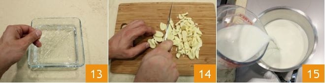 Meanwhile, prepare the cream: in a bowl, soak the gelatin sheets in cold water for at least 10 minutes 13. Chop the white chocolate with a knife 14, then place a saucepan with the cream and milk on the stove 15;