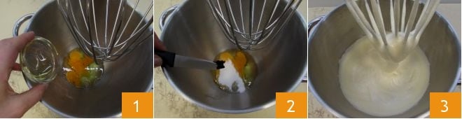To make the cocoa roll with white chocolate cream, start by preparing the cocoa sponge cake. In a stand mixer fitted with a whisk, pour in the whole eggs at room temperature and the honey 1. Split the vanilla bean lengthwise; scrape out the seeds with a small knife and add them to the eggs along with the sugar 2, then start the whisk until the mixture is light and fluffy 3. Stop the mixer and remove the whisk.