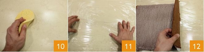 Pass a damp cloth on the work surface 10 then spread two sheets of plastic wrap slightly overlapping, 2-3 inches longer than the sponge cake dimensions 11; flip the sponge cake over 12 and let it cool: this way it won't dry out.