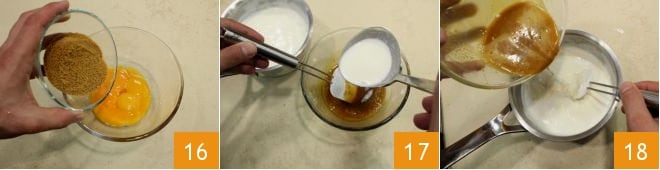 in a separate small bowl, combine the egg yolks and brown sugar 16. When the milk and cream are about to boil, temper the egg and sugar mixture by pouring in a ladle of hot milk 17; stir with a spatula to combine all the ingredients, then add it to the milk and cream mixture, cooking over very low heat 18: the cream is ready when it coats the back of a spoon;