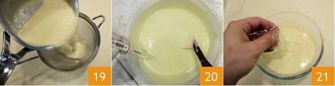 transfer it to a bowl, passing it through a fine sieve to eliminate any lumps 19 and check that it has reached a temperature of 181°F with a kitchen thermometer 20. Add the gelatin sheets, squeezing them well with your hands 21 and stir with a spatula to dissolve it completely (this step is important for the cream to reach the right consistency).