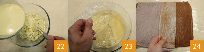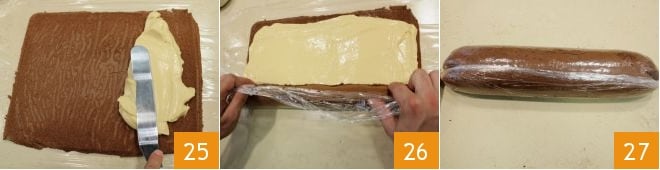 Fill the sponge cake with a layer of milk chocolate cream about 3/8 inch thick, leaving about 3/8 inch from the edge 25. When you have finished, roll up the sponge cake using the plastic wrap, starting from the longest side in front of you 26. As you roll, remember to remove the excess wrap from the edges. Once this operation is complete, twist the excess wrap on the edges 27 and holding the ends firmly, pull with your hands outward while simultaneously moving the roll away from you on the work surface, to tighten it like a candy. If bubbles form, pierce the wrap with a knife. Place in the refrigerator to set for at least 40 minutes.