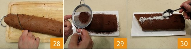 Once cooled, cut off the two ends with a smooth-blade knife 28 and place the roll on a serving plate. Dust with cocoa powder 29 and finish by distributing the chopped milk chocolate 30; finally, serve your cocoa roll with white chocolate cream, cutting it into slices.