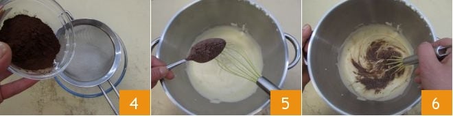 Sift the cocoa powder into a bowl 4 along with the flour and add the powders to the egg and sugar mixture one spoonful at a time 5; mix well with the whisk 6 until you get a smooth and homogeneous batter.